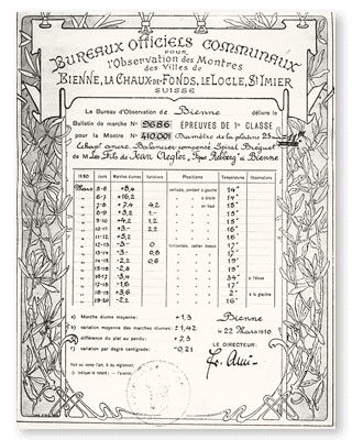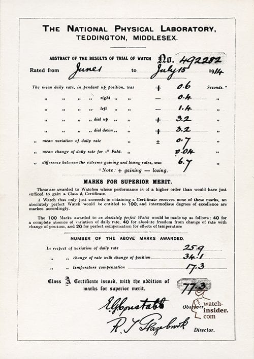 In 1910, a Rolex watch was the first wristwatch to receive the Swiss Certificate of Chronometric Precision, awarded by the Official Watch Rating Center in Bienne. (image left) 1914 – Kew Observatory in Great Britain awarded a Rolex wristwatch a Grade A precision certificate, a distinction which until that point in time only had been reserved exclusively for marine chronometers. (image right)